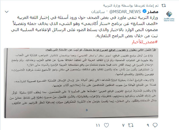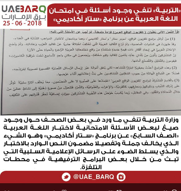 وزارة التربية تنفي ماورد في بعض الصحف حول ورود أسئلة في إختبار اللغة العربية «الصف السابع» عن برنامج «ستار أكاديمي» وهو الشيء الذي يخالف جملة وتفصيلاً مضمون النص الوارد بالاختبار والذي يسلط الضوء على الرسائل الإعلامية السلبية التي تبث من خلال بعض البرامج التلفازية.