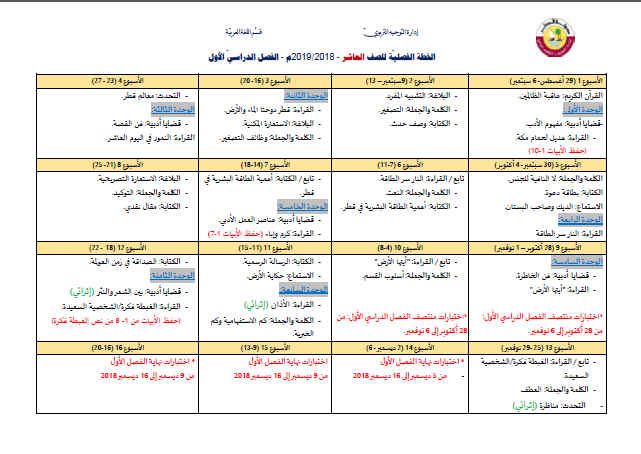 الخطة الفصلية لمادة اللغة العربية الصف العاشر المنهاج القطري الفصل الدراسي الأول 2018-2019