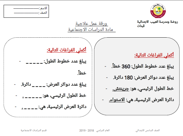 أوراق عمل علاجيه لمادة الدراسات الأجتماعيه الصف السادس الأبتدائي الفصل الأول المنهاج القطري 2018 - 2019