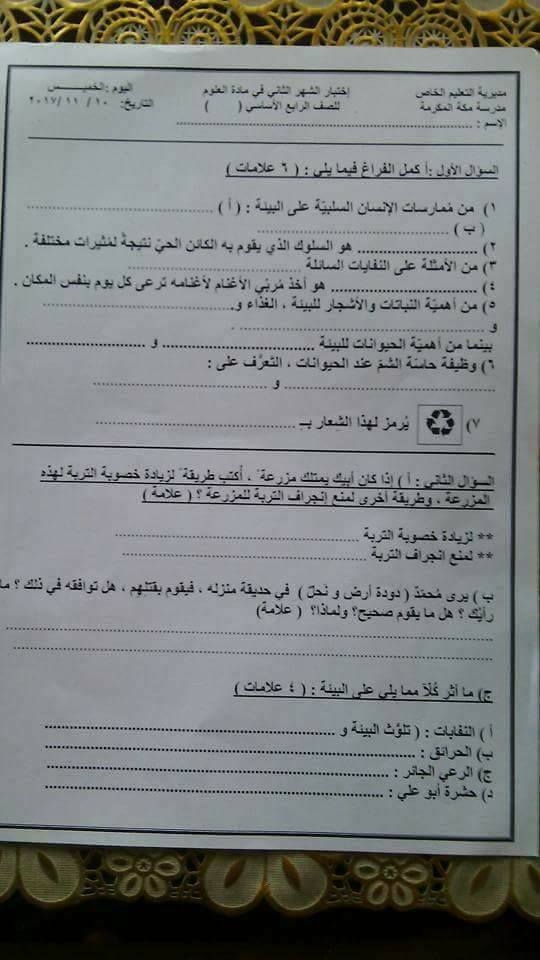 نموذج لاختبار الشهر الثاني لمادة العلوم للصف الرابع الفصل الأول