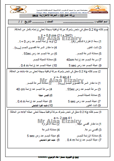 اوراق عمل الحركه الأهتزازيه لمادة الفيزياء الصف الثاني عشر متقدم الفصل الأول المنهاج القطري