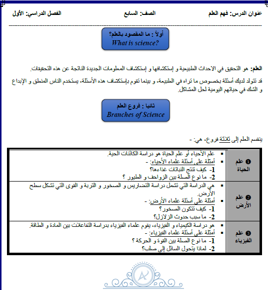 تلخيص درس فهم العلم لمادة العلوم الصف السابع الفصل الاول