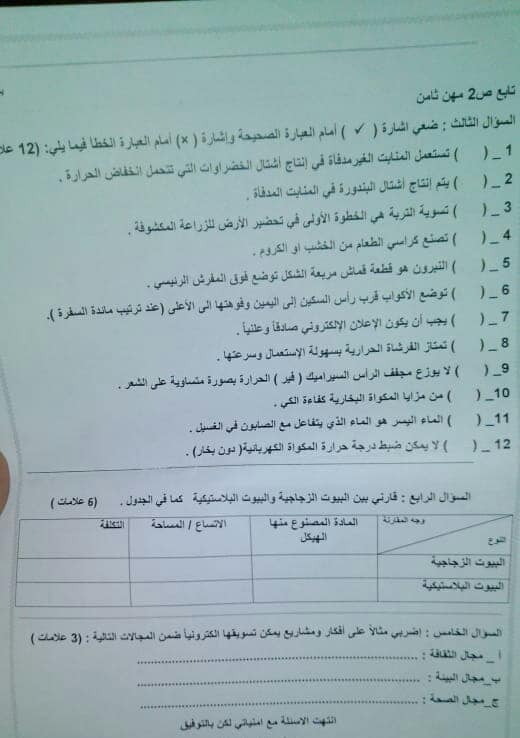 بالصور :. نموذج للاختبار النهائي لمادة التربية المهنية للصف الثامن الفصل الأول