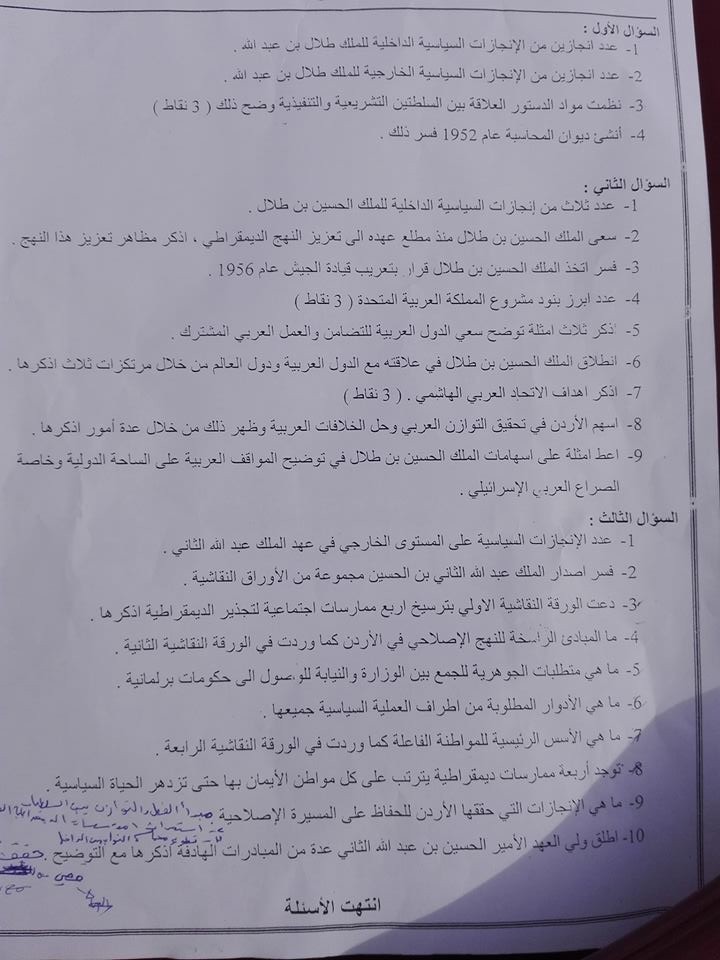 التوجيهي :اختبار مراجعة في درس الملك طلال و الملك الحسين و الملك عبدالله الثاني لمادة تاريخ الأردن
