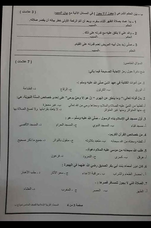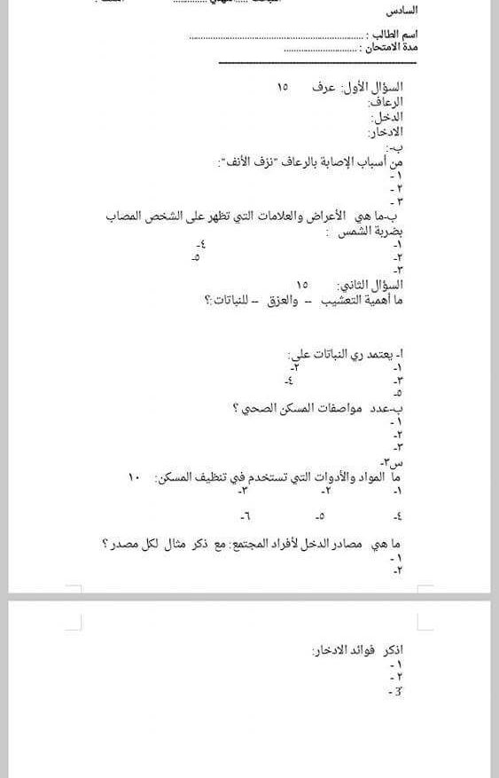 نماذج للاختبار النهائي لمادة التربية المهنية للصف السادس- الفصل الأول