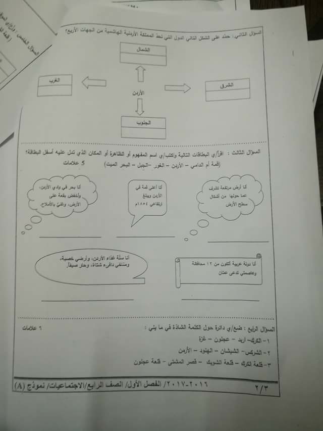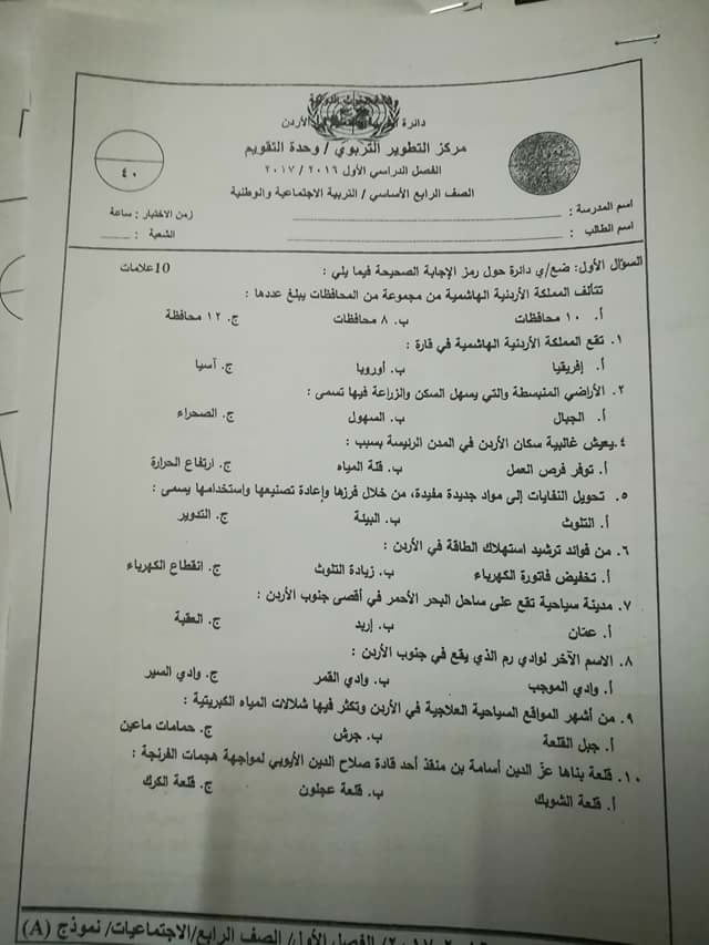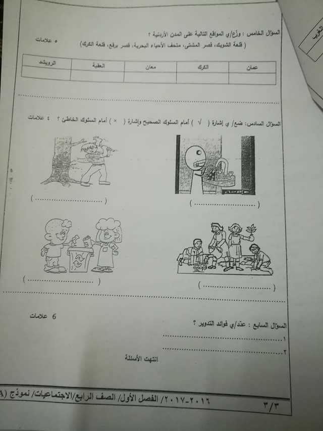 نموذج للاختبار النهائي لمادة (التربية الاجتماعية)للصف الرابع الفصل الأول