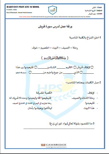 ورقة عمل لدرس سورة قريش لمادة التربية الاسلامية الصف الثاني الفصل الثاني