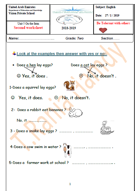 أوراق عمل (Unit 5 on the farm) لمادة اللغة الإنجليزية للصف الثاني الفصل الثاني لتحميل الملف PDF اضغط هنا وتابع