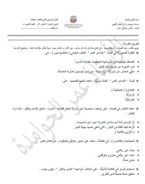 أوراق عمل الفروق الفردية لمادة اللغة العربية الصف العاشر الفصل الثاني