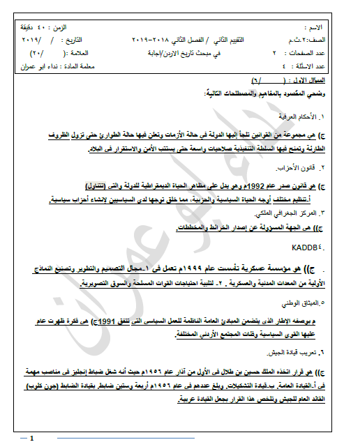 اختبار الشهر الثاني لمادة تاريخ الاردن + الاجابات النموذجية الصف الثاني عشر ( الثانوية العامة ) الفصل الثاني 2019