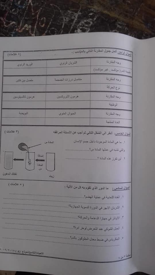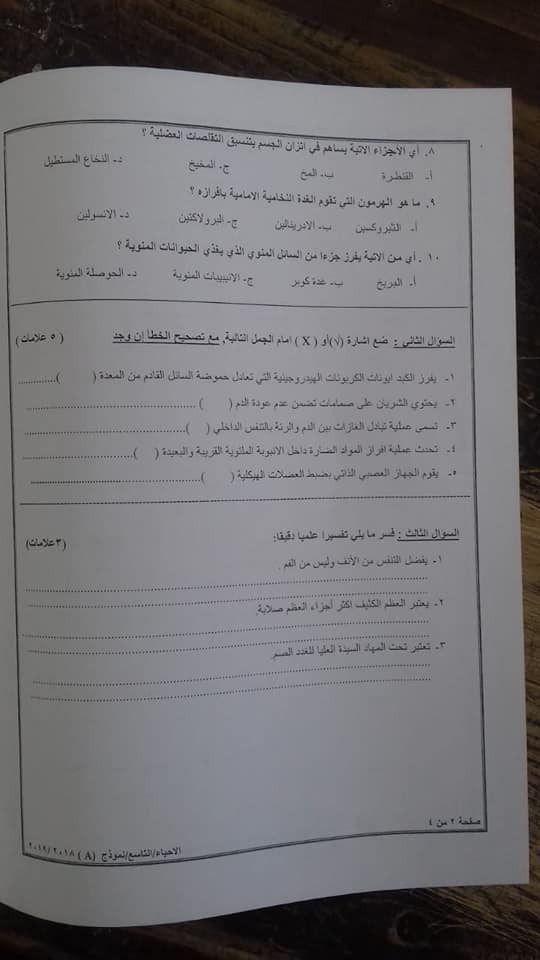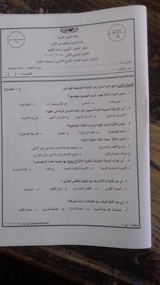 الوكالة:الاختبار النهائي لمادة الأحياء للصف التاسع الفصل الثاني