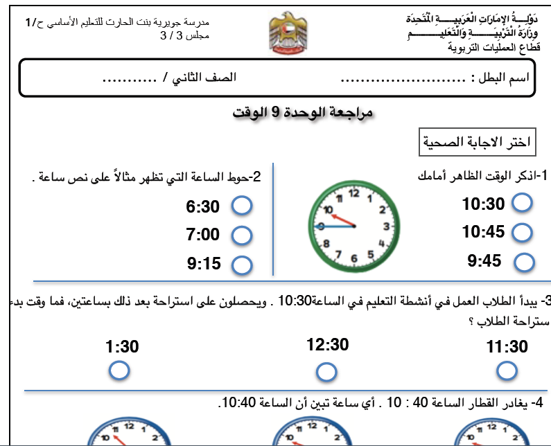 اوراق عمل الوقت لمادة الرياضيات الصف الثاني الفصل الثالث لتحميل الملف PDF اضغط هنا وتابع