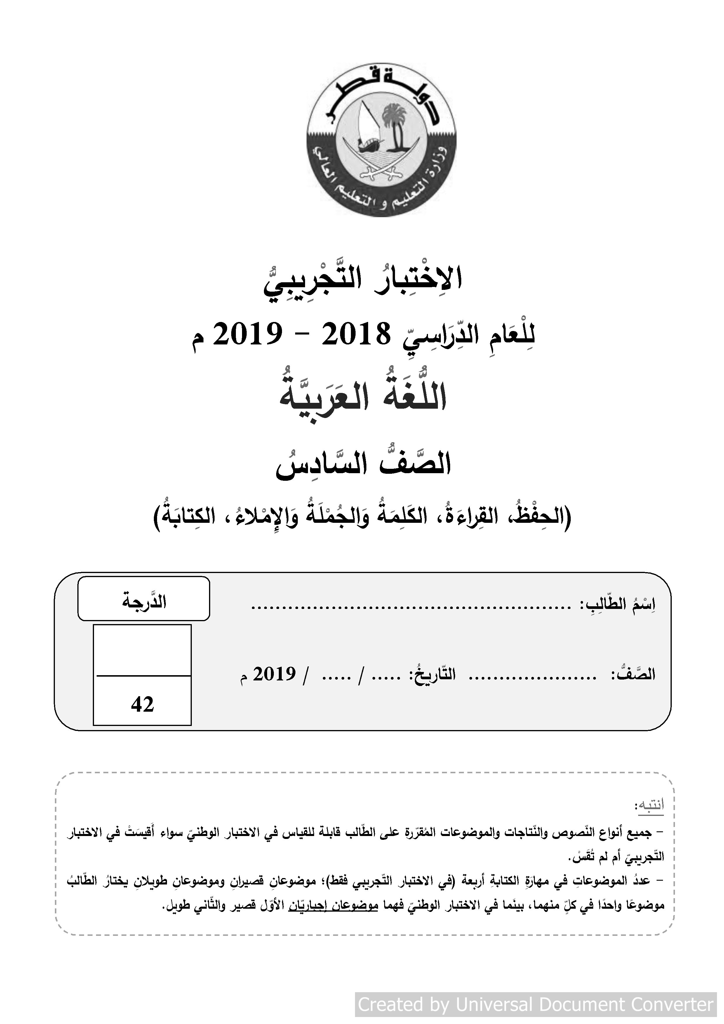 PDF المنهاج القطري:لاختبار التجريبي لمادة اللغة العربية للصف السادس الفصل الثاني