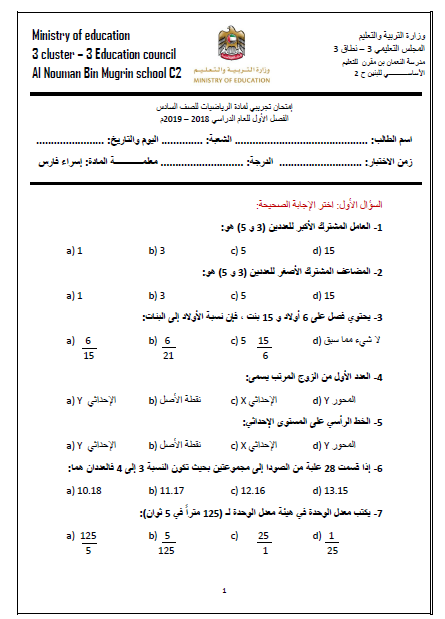 امتحان تجريبي لمادة الرياضيات الصف السادس الفصل الاول لتحميل الملف PDF من هنا