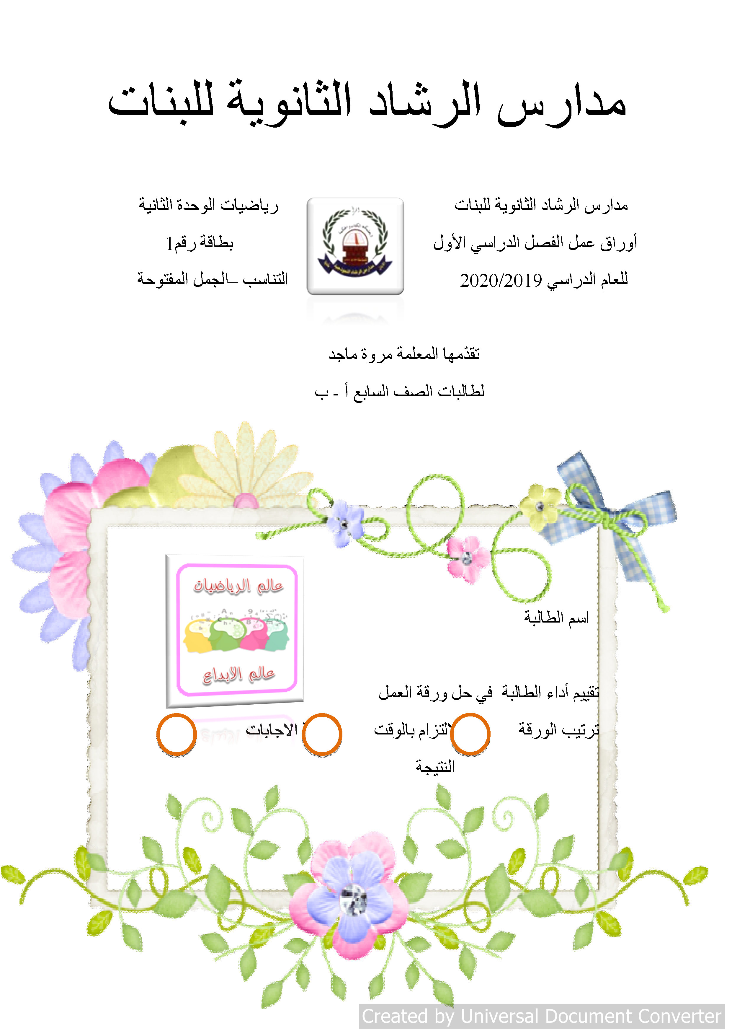 نموذج Word قابل للتعديل + نموذج PDF دوسية أوراق عمل وحدة التناسب لمادة الرياضيات للصف السابع الفصل الأول