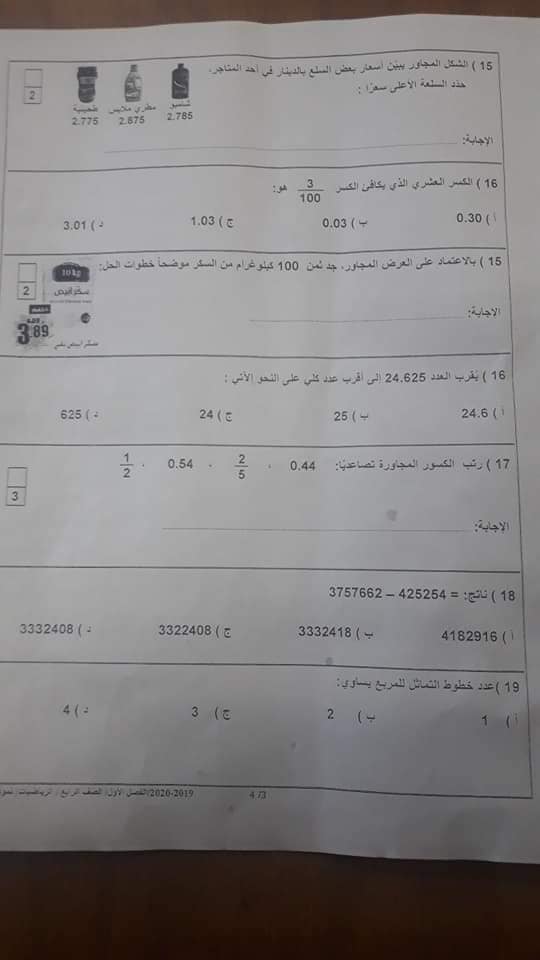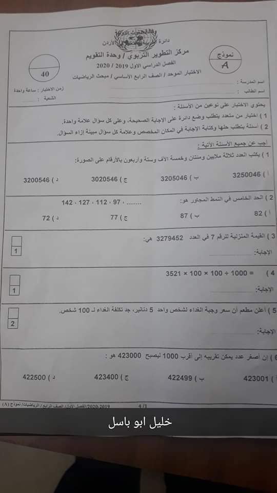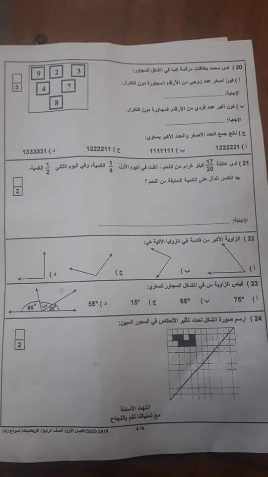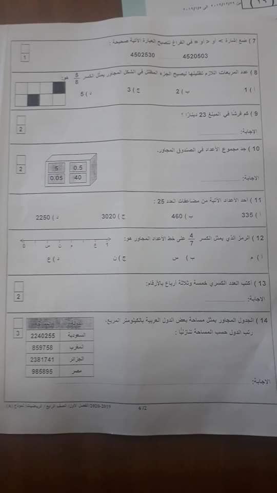 الوكالة :نموذج للاختبار النهائي لمادة الرياضيات للصف الرابع الفصل الأول