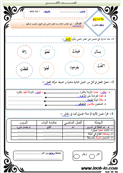 نموذج Word قابل للتعديل ورقة عمل الفعل الماضي لمادة اللغة العربية الصف الثامن الفصل الاول