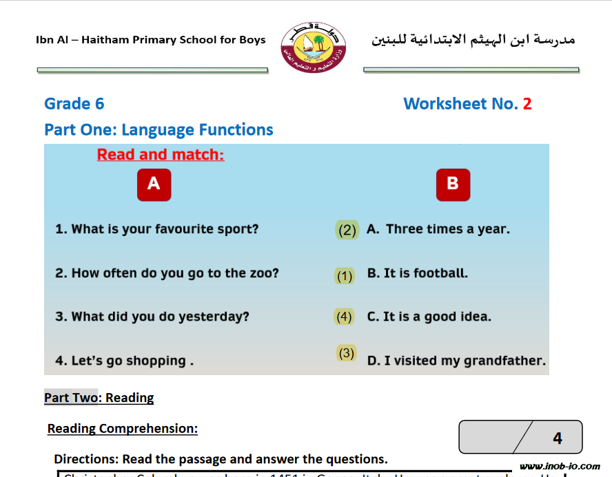 ورقة عمل -2- مع الحلول لمادة اللغة الانجليزية الصف السادس الفصل الاول