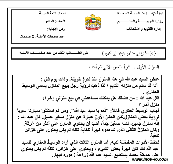 نموذج -1- امتحان لمادة اللغة العربية الصف العاشر الفصل الاول