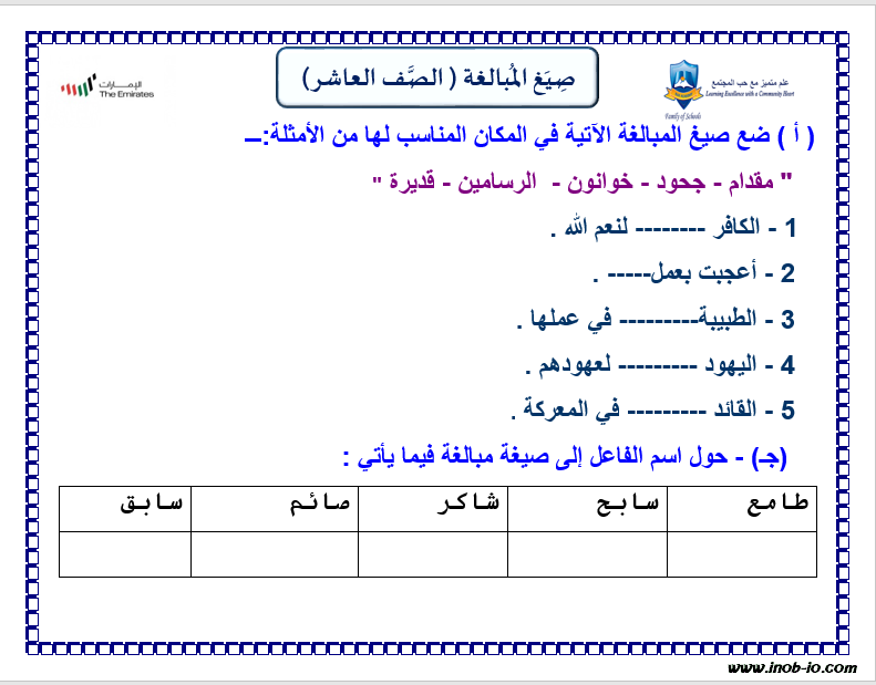 ورقة عمل صيغة لمادة اللغة العربية الصف العاشر الفصل الاول
