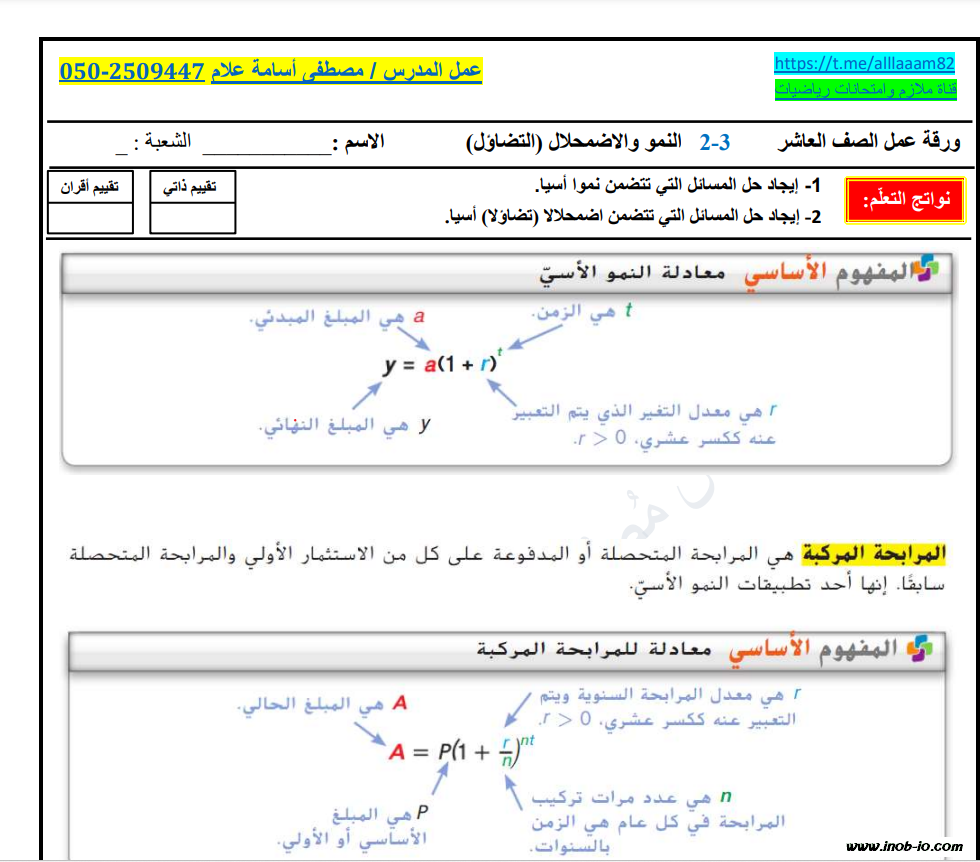 ورقة عمل مع الحلول النمو والاضمحلال التضاؤل لمادة الرياضيات المتكاملة الصف العاشر الفصل الاول