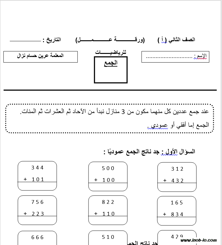 نموذج word قابل للـتعديل ورقة لدرس الجمع الذهني لمادة الرياضيات Collins الصف الثاني الفصل الاول