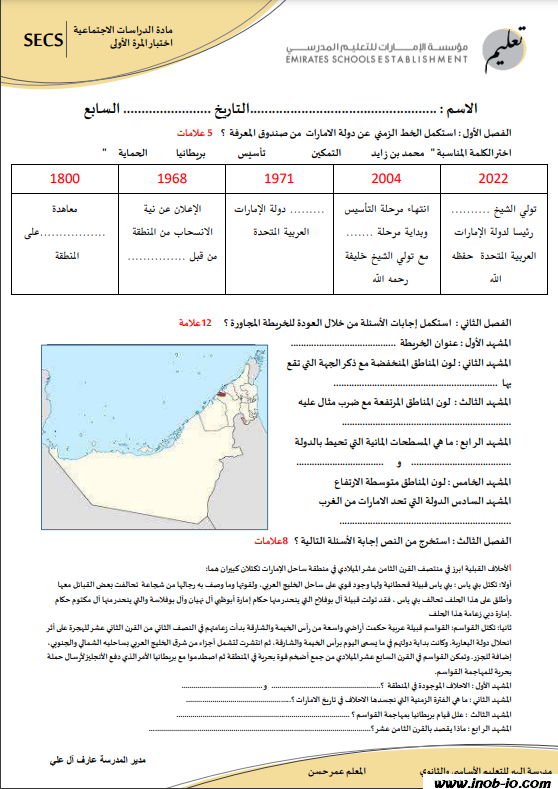 نموذج اختبار شامل لمادة الدراسات الاجتماعية والتربية الوطنية للصف السابع الفصل الثاني