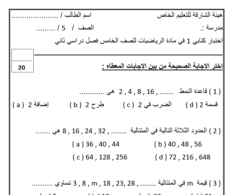 نموذج WORD الاختبار الاول اختبار تكويني لمادة الرياضيات الصف الخامس الفصل الثاني