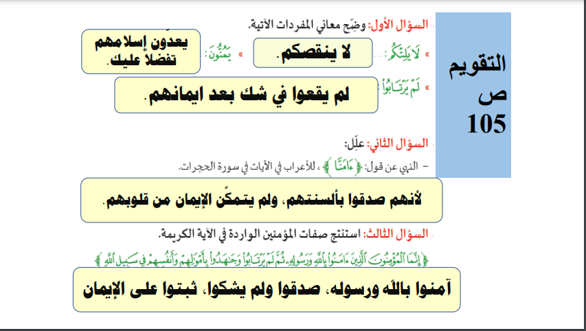 حل تقويم اللكتاب درس الإسلام والإيمان لمادة التربية الاسلامية ( الشرعية ) الصف السابع الفصل الثاني المنهاج القطري