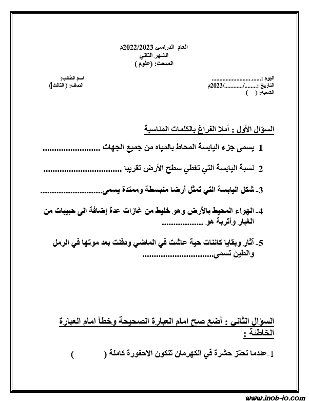 نموذج اختبار الشهر الثاني مادة اللغة العربية الصف الثالث الفصل الثاني
