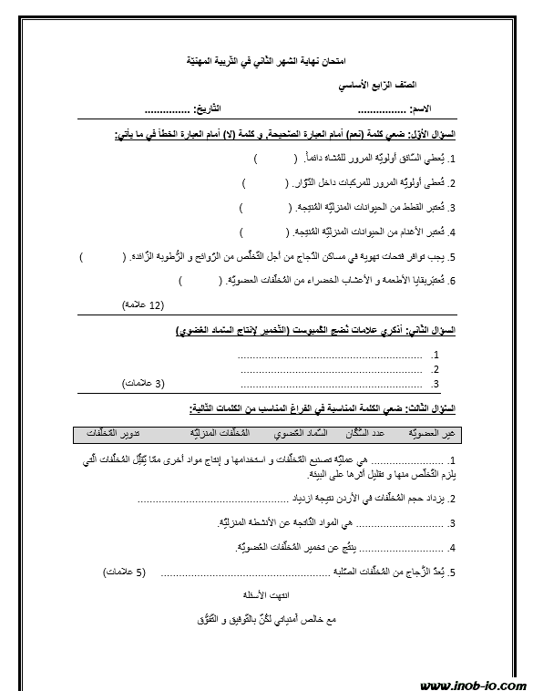 نموذج اختبار الشهر الثاني مادة التربية المهنية الصف الرابع الفصل الثاني