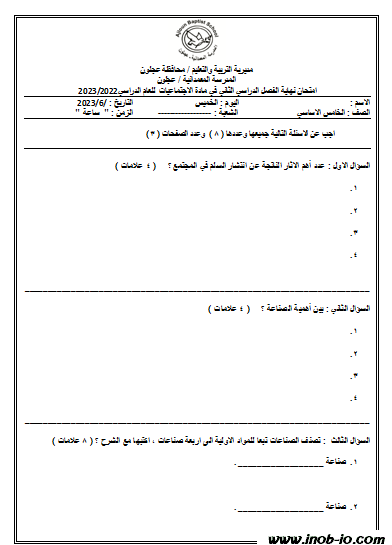 نموذج ( 1 ) اختبار نهائي مادة الاجتماعيات الصف الخامس الفصل الدراسي الثاني