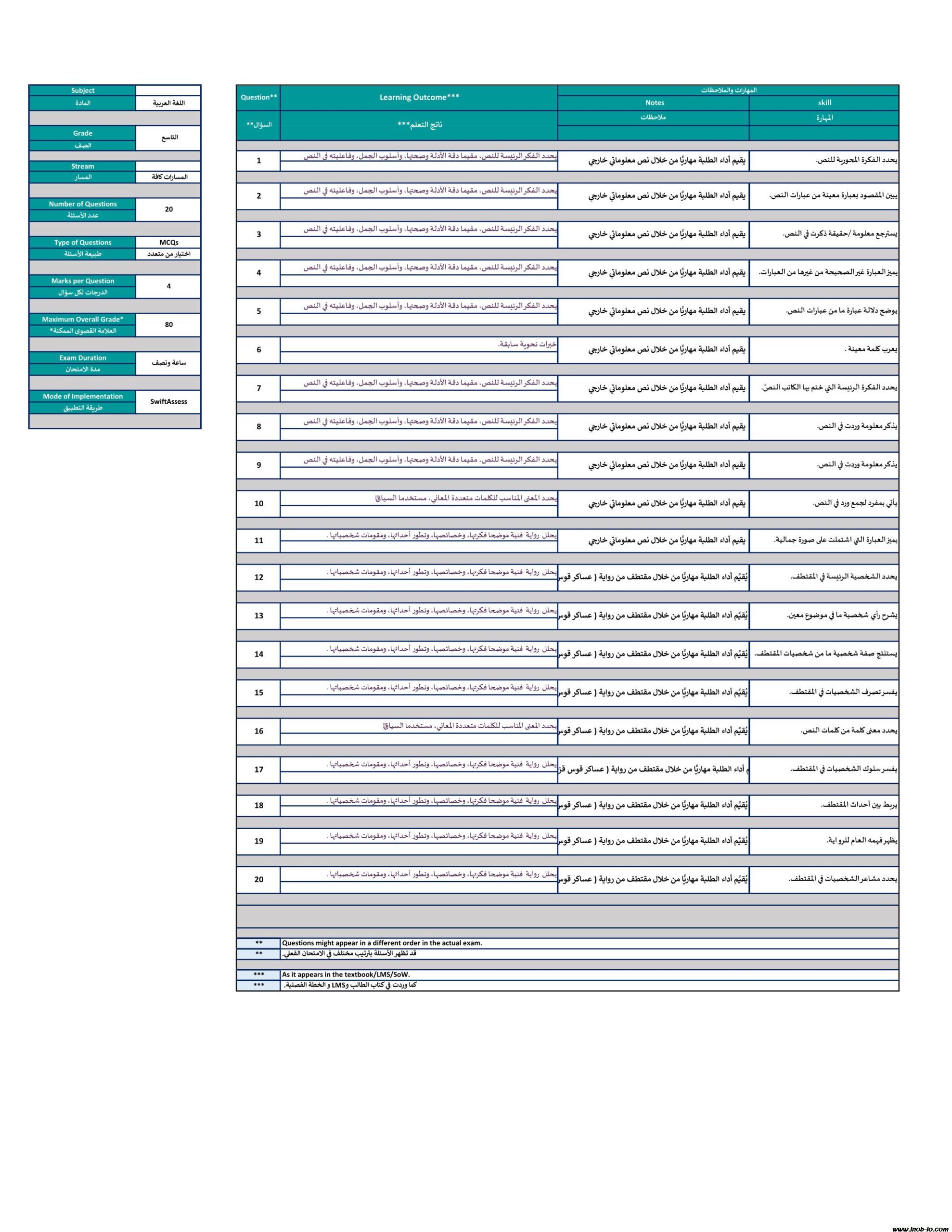 هيكل الامتحان النهائي لمادة اللغة العربية الصف التاسع الفصل الثالث