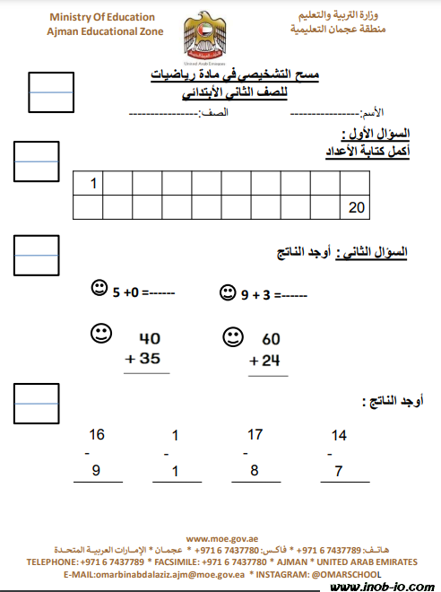 اختبار تشخيصي لمادة الرياضيات المتكاملة الصف الثاني الفصل الاول نموذج 1