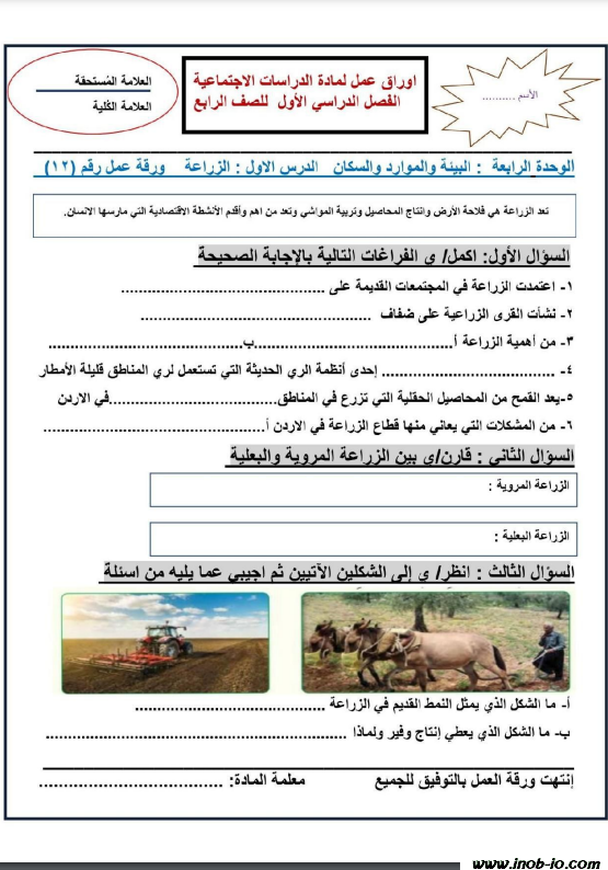 تلخيص واوراق عمل لوحدة البيئة والمواد والسكان لمادة الدراسات الاجتماعية الصف الرابع الفصل الاول 2023-2024
