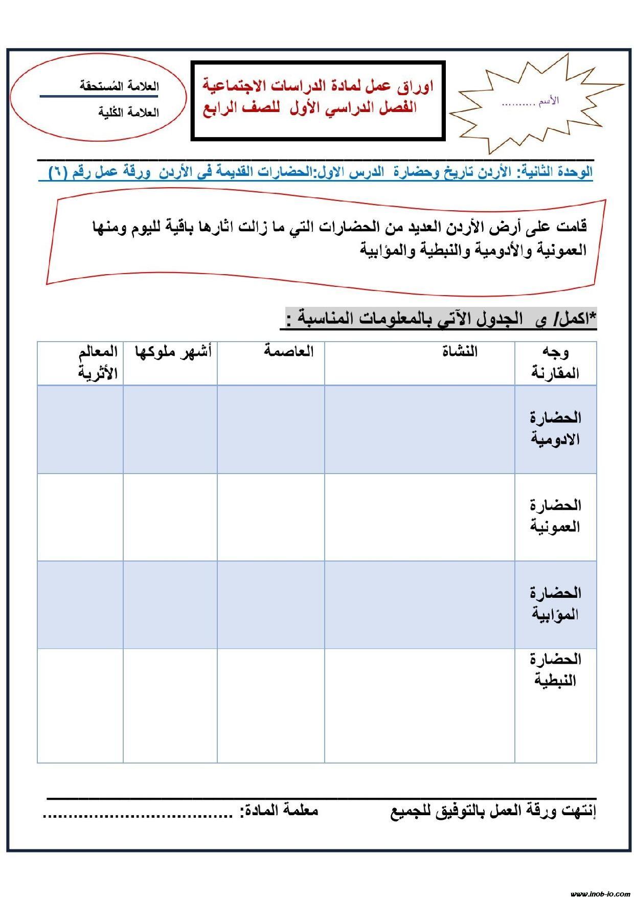 تلخيص واوراق عمل لوحدة الأردن تاريخ وحضارة لمادة الدراسات الاجتماعية الصف الرابع الفصل الاول 2023-2024