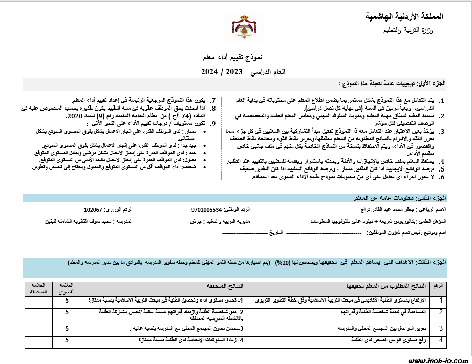 نموذج Word قابل للتعديل نموذج تقييم أداء معلم معبأ