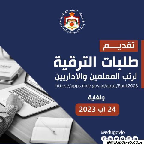 تعلن وزارة التربية والتعليم عن بدء استقبال طلبات الترقية لرتب المعلمين والإداريين عبر المنصة في موعد أقصاه الخميس 24 / 8 / 2023