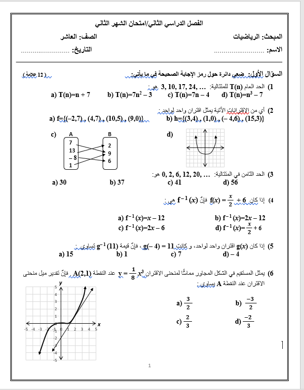 امتحان الشهر الثاني لمادة الرياضيات collins الصف العاشر الفصل الثاني