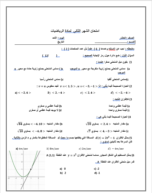 امتحان الشهر الثاني لمادة الرياضيات collins الصف العاشر الفصل الثاني