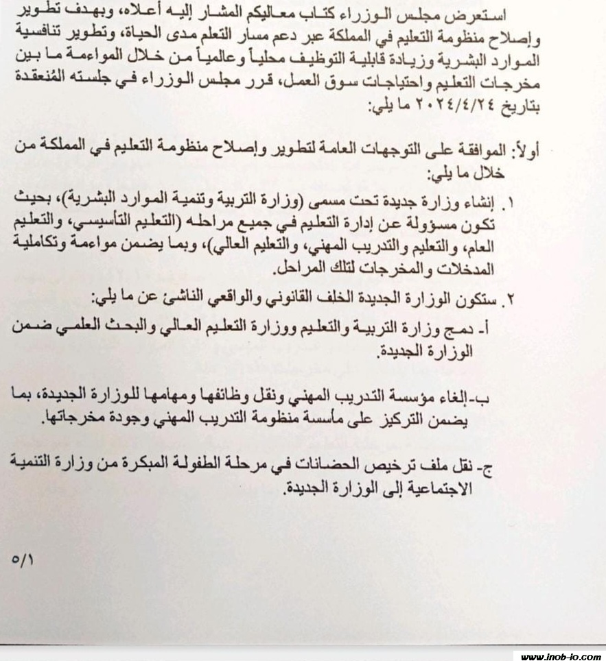 تطلع مجلس الوزراء لإنشاء وزارة جديدة تحمل مسمى ” وزارة التربية وتنمية الموارد البشرية، وذلك بهدف تطوير وإصلاح