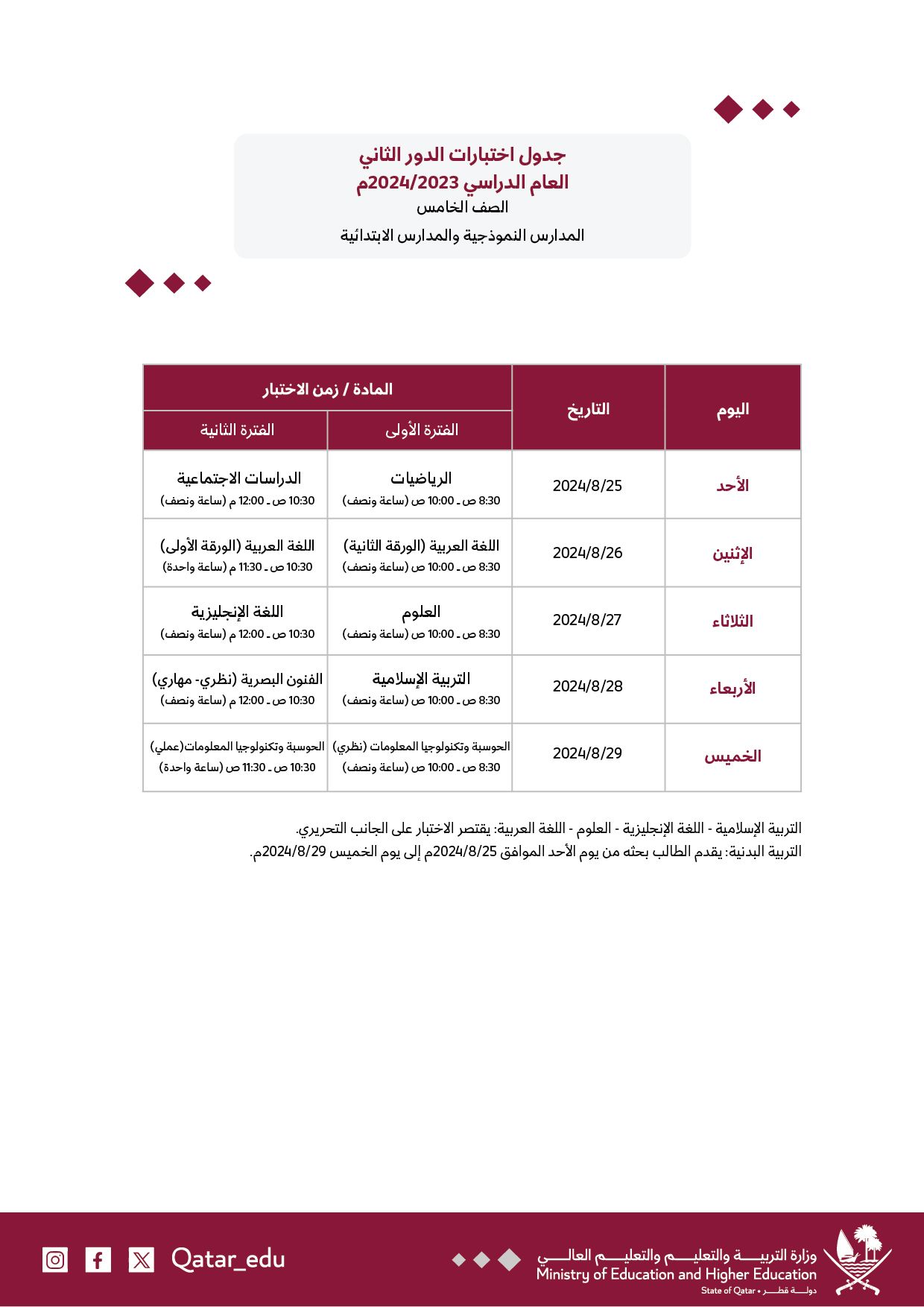 جدول اختبارات الدور الثاني المستوى الخامس لجميع المواد للعام الدراسي 2023-2024