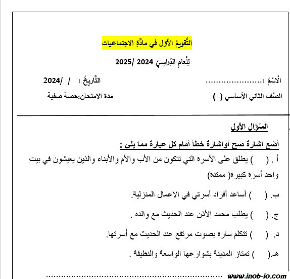 نموذج-2-اختبار الشهر الأول لمادة الدراسات الاجتماعية الصف الثاني الفصل الأول