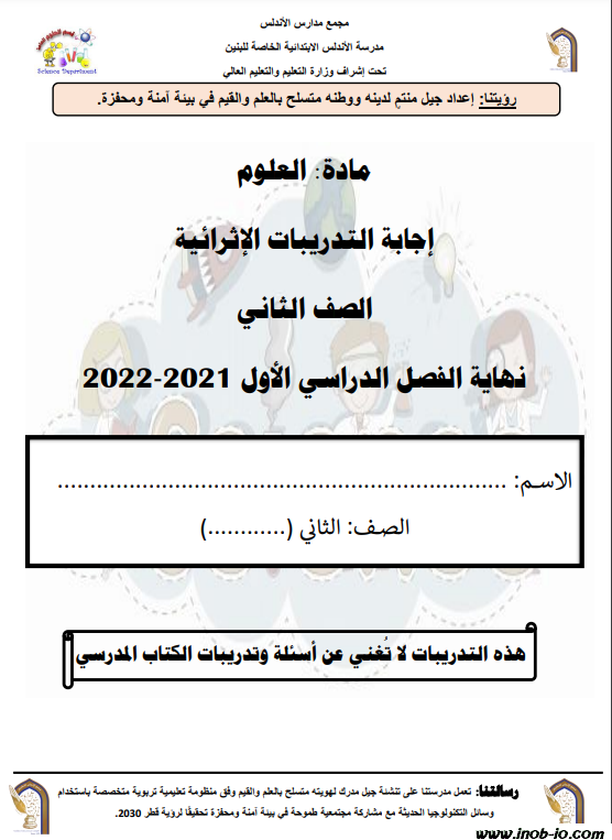 PDF تدريبات إثرائية لـ لاختبار نهاية الفصل الأول ( مجابة ) لمادة العلوم المستوى الثاني